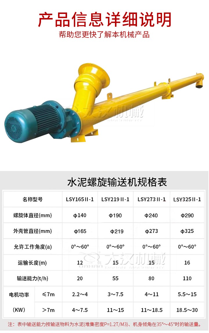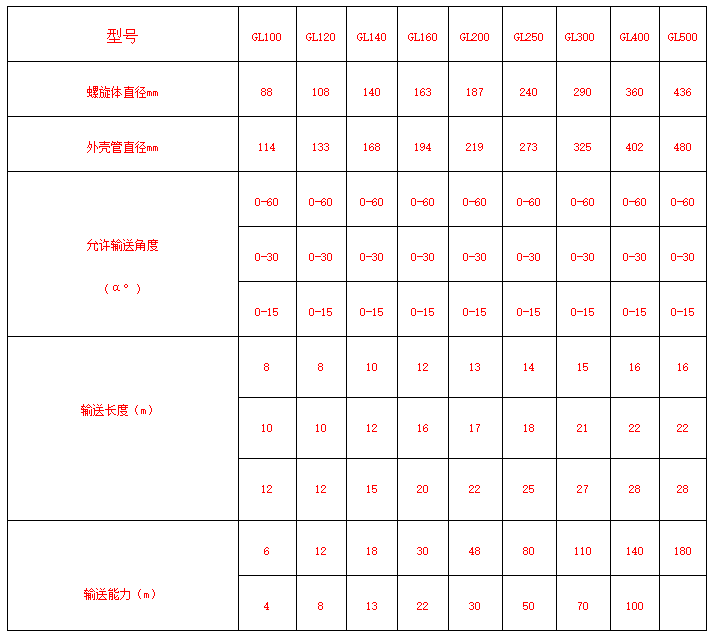 管式螺旋輸送機適用于水平或傾斜輸送粉狀、粒狀和小塊狀物料,如煤、灰、渣、水泥、糧食等,物料溫度小于200℃,不適宜輸送易變質(zhì)的、黏性大的、易結(jié)塊的物料。參數(shù)如下: