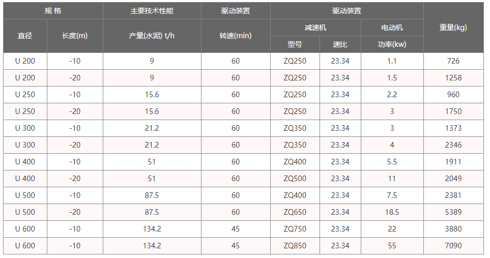 U型螺旋輸送機工作時,電機帶動旋轉(zhuǎn)的螺旋葉片將物料推移而進行輸送,螺旋輸送機旋轉(zhuǎn)軸上焊的螺旋葉片,葉片的面型根據(jù)輸送物料的不同有實體面型、帶式面型、葉片面型等型式。使物料不與螺旋輸送機葉片一起旋轉(zhuǎn)的力是物料自身重量和螺旋輸送機機殼對物料的摩擦阻力。參數(shù)如下: