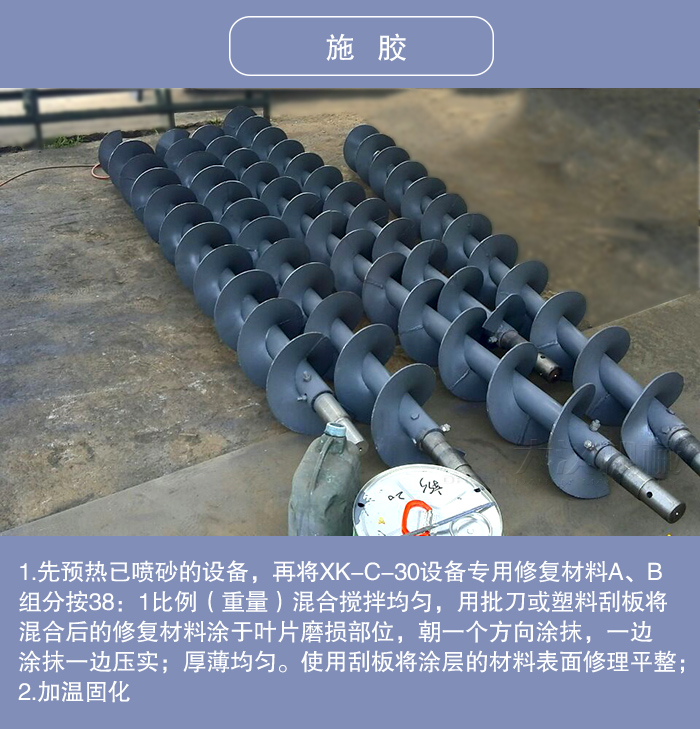 1.先預(yù)熱已噴砂的設(shè)備,再將XK-C-30設(shè)備專用修復(fù)材料A、B組分按38:1比例(重量)混合攪拌均勻,用批刀或塑料刮板將混合后的修復(fù)材料涂于葉片磨損部位,朝一個(gè)方向涂抹,一邊涂抹一邊壓實(shí);厚薄均勻。使用刮板將涂層的材料表面修理平整;