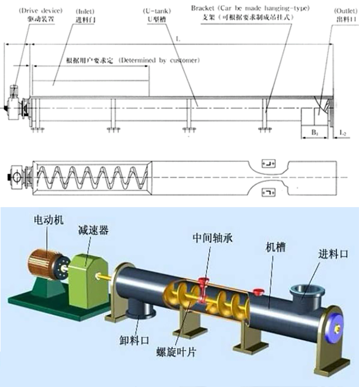 水平螺旋輸送機是將物料均勻地喂送到下道工序中,在驅(qū)動裝置中電動機帶動減速機,再由聯(lián)軸器傳遞給螺旋軸當物料從進料口進去后,在螺旋葉片的作用下將物料均勻輸出。