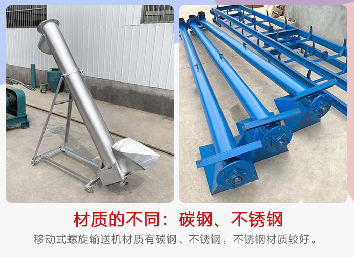 移動(dòng)式螺旋輸送機(jī)材質(zhì)有碳鋼、不銹鋼,不銹鋼材質(zhì)的價(jià)格要貴1倍左右,不銹鋼的主要用于對(duì)輸送環(huán)境要求高的行業(yè),清潔度高,不會(huì)污染物料,使用時(shí)間長(zhǎng),造價(jià)也相對(duì)高。碳鋼材質(zhì)可以主要應(yīng)用在一些對(duì)物料要求不是很嚴(yán)格或?qū)?,螺旋輸送機(jī)的衛(wèi)生沒(méi)什么特別要求的地方,例如:一些煤炭,石灰,石子等一些顆粒狀的行業(yè)。