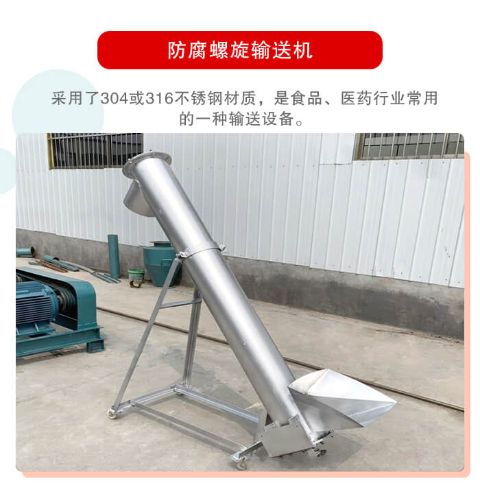 防腐螺旋輸送機(jī)采用了304或316不銹鋼材質(zhì),是食品、醫(yī)藥行業(yè)常用的一種輸送設(shè)備,今天小編就來為大家介紹一下防腐螺旋輸送機(jī)的特點及適用范圍: