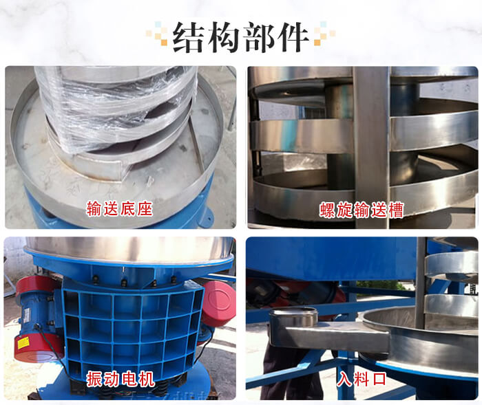 垂直螺旋提升機(jī)的主要結(jié)構(gòu)由:進(jìn)出料口、法蘭、減振系統(tǒng)、振動(dòng)電機(jī)和底座這幾部分組成。