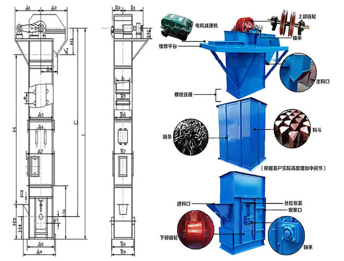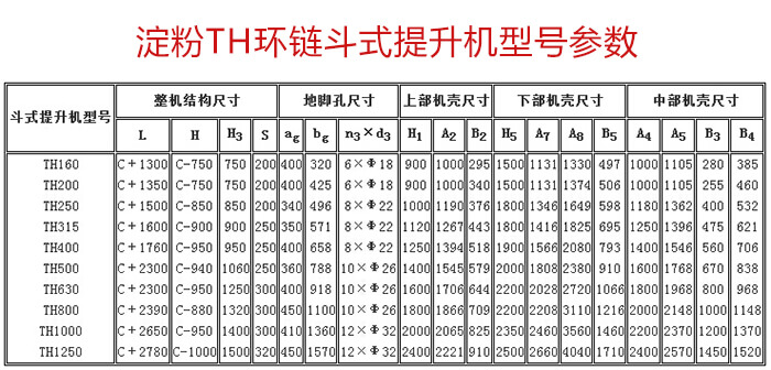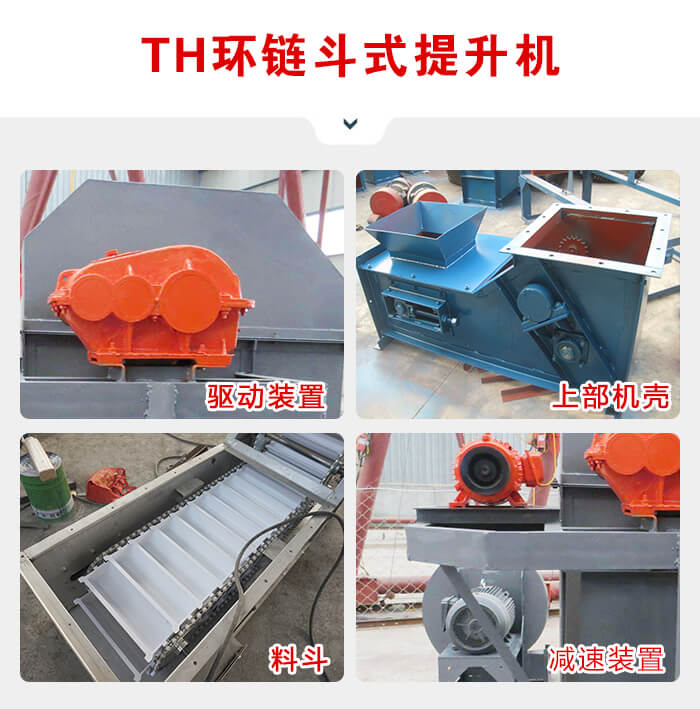 TH環(huán)鏈斗式提升機(jī)是一種常用的高效提升設(shè)備,提升產(chǎn)量大、效率高,主要由運(yùn)行部件、牽引件(輸送鏈)、驅(qū)動(dòng)裝置、上部裝置、中部機(jī)殼、下部裝置、加料口(入料口)和卸料口(出料口)組成??蛇m用與淀粉的高速提升輸送。