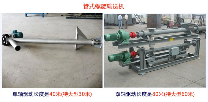 管式螺旋輸送機(jī)單軸驅(qū)動長度是40m(特大型30m),雙軸驅(qū)動長度是80m(特大型60m),長度劃分是每一檔0.5m,可根據(jù)自身需求選擇。