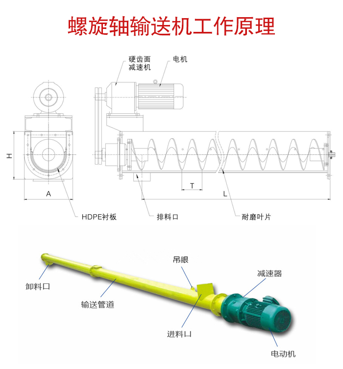 螺旋軸輸送機主要由驅(qū)動裝置,機殼、蓋板、螺旋軸、螺旋葉片、進(jìn)料口、出料口等部件組成。