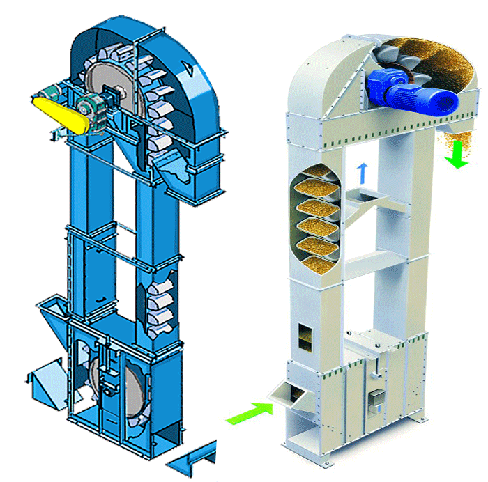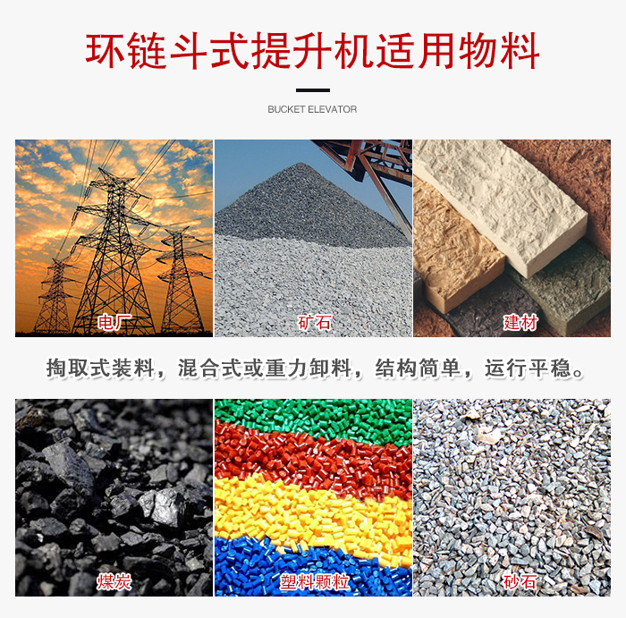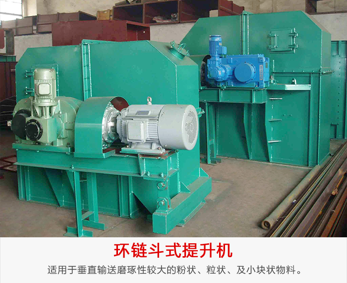 環(huán)鏈斗式提升機適用于垂直輸送磨琢性較大的粉狀、粒狀、及小塊狀物料,如糧食、煤、水泥、碎礦石等,輸送高度不超過40m,其特點為,結構簡單,運行平穩(wěn),掏取式裝料,混合式或重力卸料,輪緣采用組合鏈輪,更換方便,鏈輪輪緣經(jīng)特殊處理壽命長,下部如采用重力自動張緊裝置,能保持恒定的張力,避免打滑或脫鏈,同時在料斗遇阻時,有一定的容讓性能夠有效地保護運動部件,物料溫度不超過250℃。